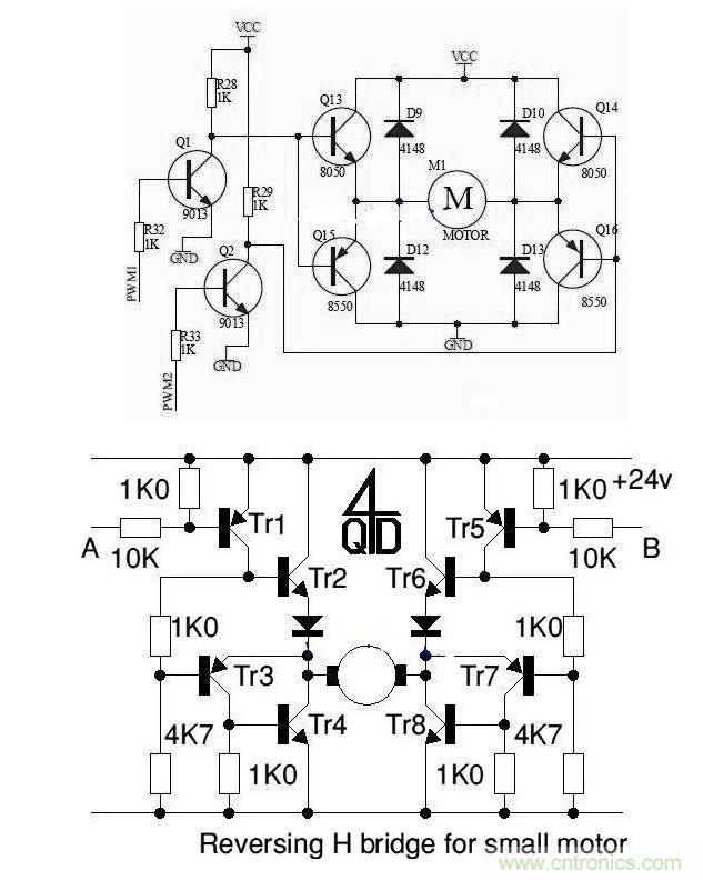 驅動電機時,保證H橋上兩個同側的三極管不會同時導通非常重要。如果三極管Q1和Q2同時導通,那么電流就會從正極穿過兩個三極管直接回到負極。此時,電路中除了三極管外沒有其他任何負載,因此電路上的電流就可能達到最大值(該電流僅受電源性能限制),甚至燒壞三極管?;谏鲜鲈?,在實際驅動電路中通常要用硬件電路方便地控制三極管的開關。