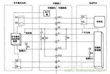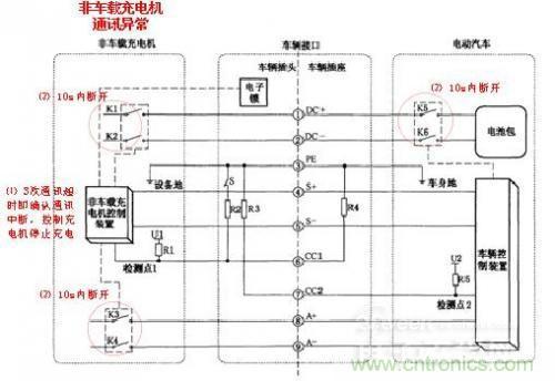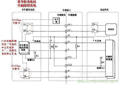 2)在充電過程中,非車載充電機控制裝置通過對檢測點1的電壓進行檢測,如果判斷車輛接口由完全連接變?yōu)閿嚅_(如車輛意外移動、充電槍線纜被意外擾動等),則控制非車載充電機停止充電,應在100ms內(nèi)斷開K1、K2、K3、K4。
