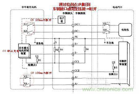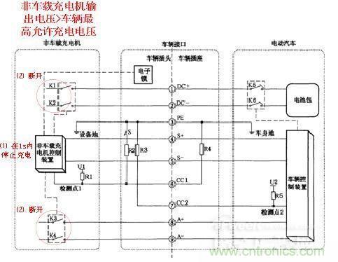 1)在充電過程中,非車載充電機控制裝置通過對檢測點1的電壓進行檢測,如果判斷開關(guān)S由閉合變?yōu)閿嚅_(如充電槍上按鍵失靈或誤觸發(fā)等),應在50ms內(nèi)將輸出電流降至5A或以下;