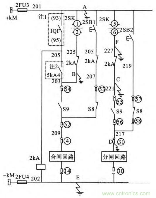 如上圖所示,直流接地故障發(fā)生在C、E兩點,D、E兩點,F(xiàn)、E兩點接地時,分閘線圈被短接,保護動作及操作時開關(guān)拒跳。同理,兩點接地開關(guān)也可能合不上,如B、E兩點接地時。