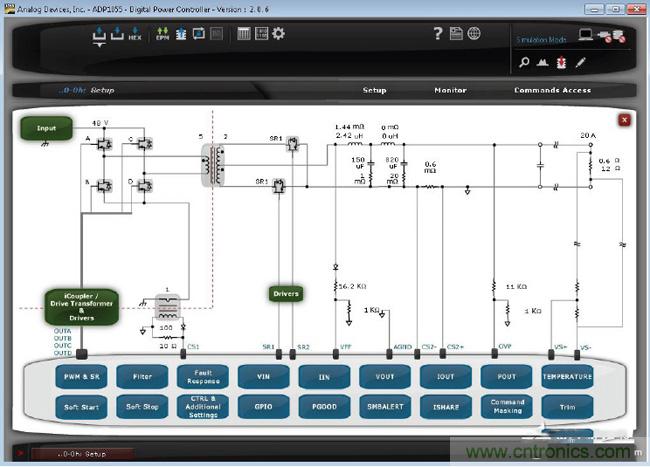 圖形用戶界面(GUI)是這種困境的一種解決方案。因?yàn)镚UI可簡(jiǎn)化數(shù)字電源的編程。許多數(shù)字控制器IC供應(yīng)商均提供GUI。通常,GUI的設(shè)計(jì)方式能夠使電源專家直觀地使用它們。圖1顯示了這樣的圖形用戶界面。您可用鼠標(biāo)選擇電源的不同方面,在屏幕上的不同功能框圖中進(jìn)行不同的設(shè)置。