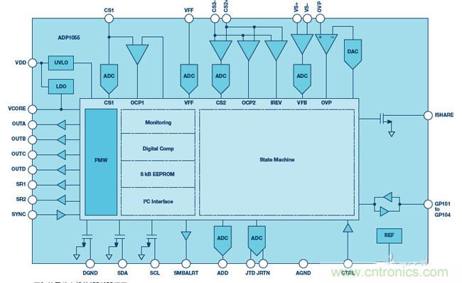 現(xiàn)在,存在許多基于狀態(tài)機(jī)的電源控制器。圖2中的ADP1055設(shè)計(jì)用于不同拓?fù)浣Y(jié)構(gòu)的直流隔離電源。但是,它還可用于采用交錯(cuò)技術(shù)的負(fù)載點(diǎn)(POL)應(yīng)用中。