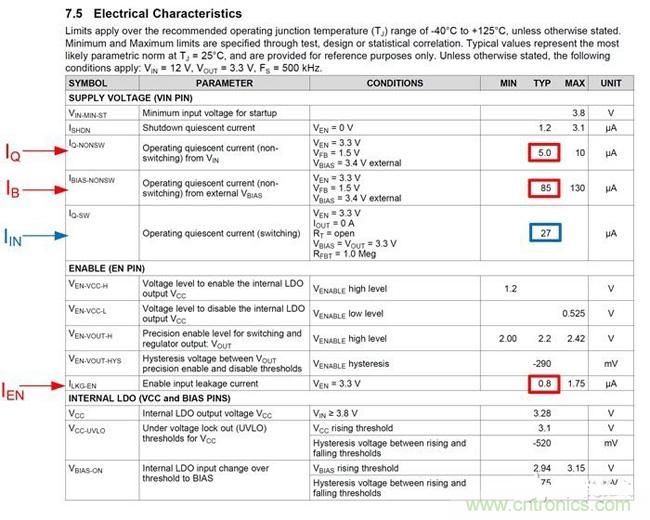 數(shù)據(jù)項IB 代表流入我剛剛談到的偏置輸入的電流。我們以3.5V至36V,3A同步降壓轉(zhuǎn)換器SIMPLE SWITCHER? LM43603為例。這個數(shù)據(jù)表中有以下這些典型值(表1)。