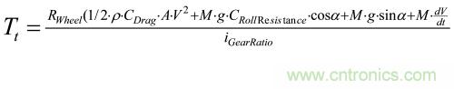 根據(jù)受力分析,我們可以推導(dǎo)出電動汽車行駛驅(qū)動力公式、驅(qū)動阻力公式、摩擦阻力公式、坡道阻力公式和加速阻力公式,進(jìn)而可得到電動汽車的動態(tài)運(yùn)動微分方程: