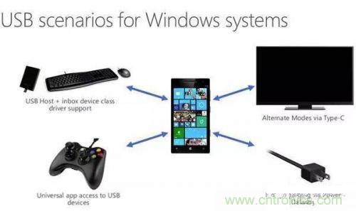 微軟Windows 10引入對Type-C的支持,不僅桌面版Windows 10原生支持USB Type-C接口,手機版Windows 10也支持,可以輕松實現(xiàn)搭載Windows 10操作系統(tǒng)的手機與USB主設備或者是USB配件兩者之間進行數(shù)據(jù)交換以及視頻共享。例如:手機與USB外圍設備交互數(shù)據(jù),支持XboxOne遙控器、鼠標、鍵盤、插座以及使用USB Type-C接口外接顯示器或電視等,Type –C或?qū)㈤_創(chuàng)連接新模式。