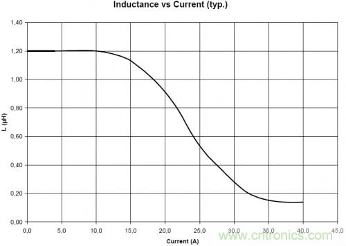 電感中直流電流的增加時(shí),電感透磁率的數(shù)值會(huì)逐漸減少,因此電感值會(huì)緩慢下降。電感廠商會(huì)根據(jù)電感的電感值的下降程度為指標(biāo)的額定電流,"基于電感值的變化率的額定電流",即Saturation Current,大部分電感廠商將電感值下降20%時(shí)的通過(guò)電感直流電流作為額定電流。下圖是Wurth公司某款電感的電感值vs電流的曲線圖。該款電感規(guī)格書(shū)上將saturation current設(shè)定為電感值下降10%時(shí)的電流值,為16.6A。如果將saturation current設(shè)定為電感值下降20%時(shí)的電流值的話,大約為18.2A。