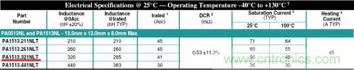 所以在實(shí)際的使用中,簡(jiǎn)單來(lái)說(shuō),一般選擇兩個(gè)電流值里面比較小的那個(gè)作為設(shè)計(jì)限值。比如下圖中的4個(gè)PLUSE電感的 Irated,均取的Heating Current和Saturation Current其中的相對(duì)小的那個(gè)作為額定電流 。 (注意PA1513.321這個(gè)器件,為什么Irated不是45A?注意Pulse的Saturation Current定義為20%的電感值下降,41A的時(shí)候只有10%的電感值下降。)