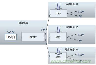 該電源的輸入是新能源乘用車常規(guī)的12V電源,該電源通常波動(dòng)范圍是8~16V,而驅(qū)動(dòng)電源的輸出需要相對穩(wěn)定。需要設(shè)計(jì)多組寬壓輸入、定壓輸出的隔離電源。本設(shè)計(jì)把電源分成兩級:前級電源實(shí)現(xiàn)寬壓輸入、定壓輸出功能,后級實(shí)現(xiàn)隔離功能,結(jié)構(gòu)見圖1.