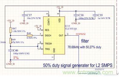 前級電源屬于典型定壓設(shè)計(jì),無需給出設(shè)計(jì)原理,本文重點(diǎn)介紹后級半橋電路。具體原理圖見圖2和圖3。圖2為采用汽車級定時(shí)器電路設(shè)計(jì)的50%占空比信號發(fā)生器,用于給半橋開關(guān)電源提供控制信號,其中R49可以用來調(diào)整開關(guān)頻率,一般可以設(shè)定在70kHz到300kHz之間,頻率選擇主要根據(jù)電路板實(shí)際空間尺寸和變壓器的伏秒積進(jìn)行折衷選取。