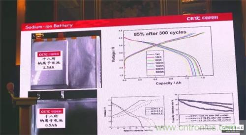 我們做了1.5Ah和0.5Ah兩種軟包全電池,正極材料采用前面提到的鎳錳氧化物,負極采用生物質(zhì)的硬碳材料,經(jīng)300次循環(huán)后容量衰降為15%。由此可見,鈉離子電池用廉價材料是可以制備的,而且電性能良好。