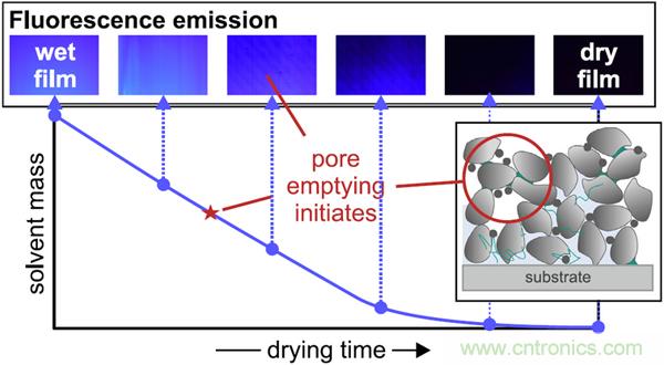 德國卡爾斯魯厄理工學(xué)院薄膜技術(shù)研究所的Stefan Jaiser等人引入了一種實(shí)驗(yàn)裝置,在涂層干燥溶劑蒸發(fā)過程中能夠測量涂層的收縮,涂層表面液體含量,以及表面孔洞消失的過程。在電極漿料中少量加入一種熒光增白劑,涂層中的液體在UV-A紫外線輻照下能夠發(fā)出藍(lán)光,因而可以用相機(jī)觀察到液相。圖像處理可以估算涂層表面的液體含量,跟蹤電極孔隙中的液相消失過程。同時,濕涂層的厚度采用二維激光位移傳感器測量。實(shí)驗(yàn)結(jié)果揭示了液相去除,電極孔隙中開始形成的時刻。