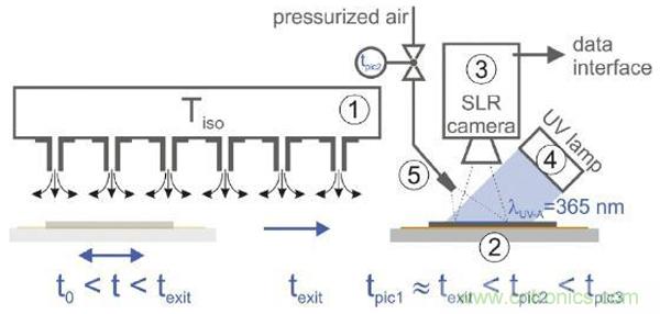 ①-對流槽噴嘴干燥機(jī),②-溫控板,③-SLR相機(jī),④-UV燈,⑤-加壓空氣噴嘴