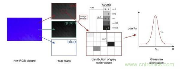原始的RGB圖像分割成紅(red)、綠(grenn)、藍(lán)(blue)三原色,將圖像劃分為10 X 10個部分,計(jì)算分析每個部分細(xì)節(jié)。對像素點(diǎn)三原色分量灰度值進(jìn)行計(jì)數(shù),然后做成高斯分布圖,標(biāo)準(zhǔn)偏差σ和平均灰度值nmax作為圖像處理的特征量