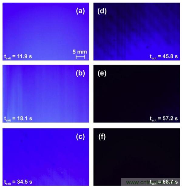 圖3.不同的干燥時間之后捕捉到的RGB圖像,干燥時間從(a)11.9s到(f)68.7s