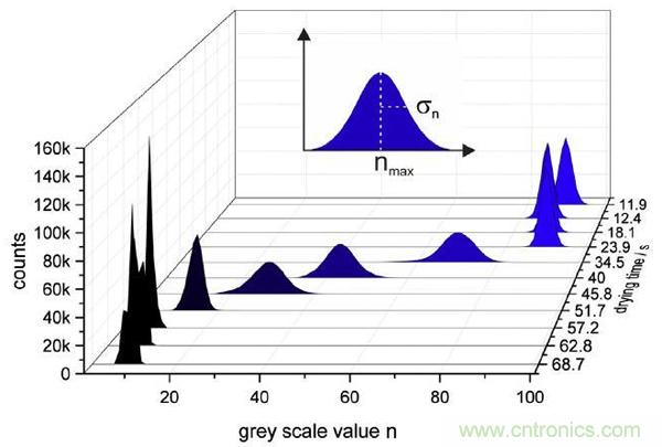 圖2為圖像處理流程,每個圖像都是RGB灰度值疊加照片,首先將照片分割成紅(red)、綠(grenn)、藍(lán)(blue)三原色各自的顏色通道。本文中只分析紅色通道,因?yàn)樗{(lán)色在長時間干燥后仍舊飽和狀態(tài),因而缺少最開始的信息,而綠色值強(qiáng)度低,接近零。采用MATLAB對圖像進(jìn)行處理,讀取每一個像素的灰度值并計(jì)數(shù),再做成灰度值高斯分布圖。標(biāo)準(zhǔn)偏差σ和平均灰度值nmax作為圖像處理的特征量,nmax表示涂層表面液體的含量。