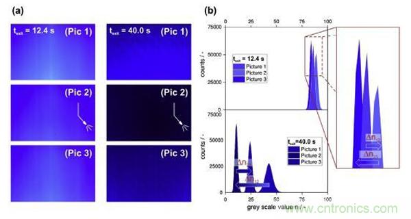 圖5.(a)在兩個干燥時刻,各自連續(xù)拍攝的三張照片的比較。捕捉第二張照片時,用加壓空氣噴嘴向照相區(qū)域涂層上直接噴射空氣氣流。(b)在較短干燥時間(texit=12.4s)時,三張照片中獲得的nmax都很大,差值Δn12和Δn23小并且都落在試驗(yàn)值偏差范圍內(nèi)。而texit=40.0s時,三個nmax都很小,噴嘴作用導(dǎo)致的差值Δn12和Δn23很大。