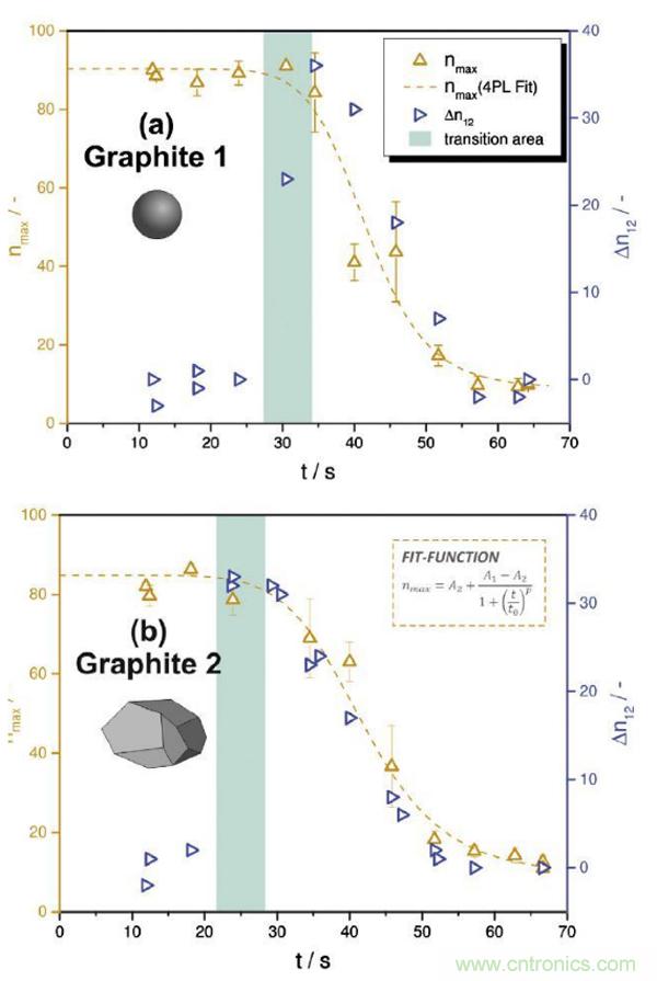 圖6.在烘干機(jī)中不同停留時間下第一張照片的nmax(三次實(shí)驗(yàn)平均值),以及第一、二張照片的差值Δn12(單次實(shí)驗(yàn))的對比:(a)Graphite 1 (球形, d50 = 8.9 μm) , (b) Graphite 2 (多面體, d50 = 20.4 μm)。nmax與四參數(shù)邏輯(4PL)擬合曲線近似,并表明了不同的初始平臺。從恒定nmax平臺到中間階段的過渡時域以綠色突出顯示。