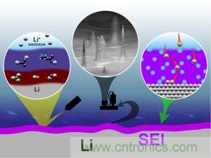 金屬鋰負(fù)極應(yīng)用繞不開的是鋰枝晶的問題,早期人們對(duì)于鋰枝晶的認(rèn)識(shí)主要來自于其他金屬電解過程中枝晶產(chǎn)生機(jī)理,對(duì)于鋰電池內(nèi)鋰枝晶形成機(jī)理更多是“猜測”。而在2014年,美國橡樹嶺國家實(shí)驗(yàn)室的Robert L. Sacci等「2」利用原位透射電鏡技術(shù)直接在玻璃碳表面觀測到了鋰枝晶的形成過程,從下面的動(dòng)畫可以看到,不同于傳統(tǒng)的枝晶的概念,鋰枝晶首先以球形出現(xiàn)的,其表面擁有一些納米球,這些納米球具有一定角度的小面,隨后的在一次鋰顆粒的表面進(jìn)行的二次結(jié)晶生長,會(huì)產(chǎn)生許多其他形狀的鋰