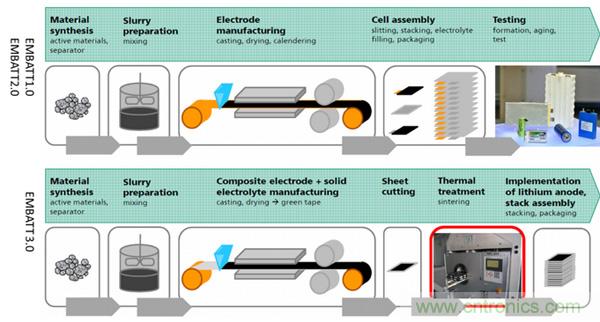在制造工藝方面,1.0和2.0的制造工藝與現(xiàn)行的鋰離子電池制造工藝沒有明顯區(qū)別,在3.0上,由于采用全固態(tài)玻璃陶瓷電解液,因此電極和電解質(zhì)的裝配可以在同一步驟完成,省卻了后面的注液環(huán)節(jié),但是后續(xù)增加了熱處理環(huán)節(jié),主要是為了讓電極和固態(tài)電解質(zhì)界面更好的接觸。這3.0項(xiàng)目上,全固態(tài)電解質(zhì)的開發(fā)、電解質(zhì)與電極界面兼容性問題是重點(diǎn)研究內(nèi)容,這與一般的固態(tài)電池的研究課題是一致的。
