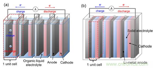 下圖對比了傳統(tǒng)鋰離子電池(a圖)和雙極性鋰電池(b圖,這里是以金屬鋰和全固態(tài)為例)。a圖中,每個(gè)電池單元unit cell包括了正極(一般涂覆在Al基材)、負(fù)極(一般涂覆在Cu基材);b圖中,每個(gè)電池單元unit cell同樣包括了正極、負(fù)極,但是正極、負(fù)極活性材料共用一個(gè)基材:當(dāng)兩個(gè)電池單元串聯(lián)起來時(shí),雙極性電極的一側(cè)在當(dāng)前單元電池作為負(fù)極,另一側(cè)在相鄰單元電池中是作為正極。