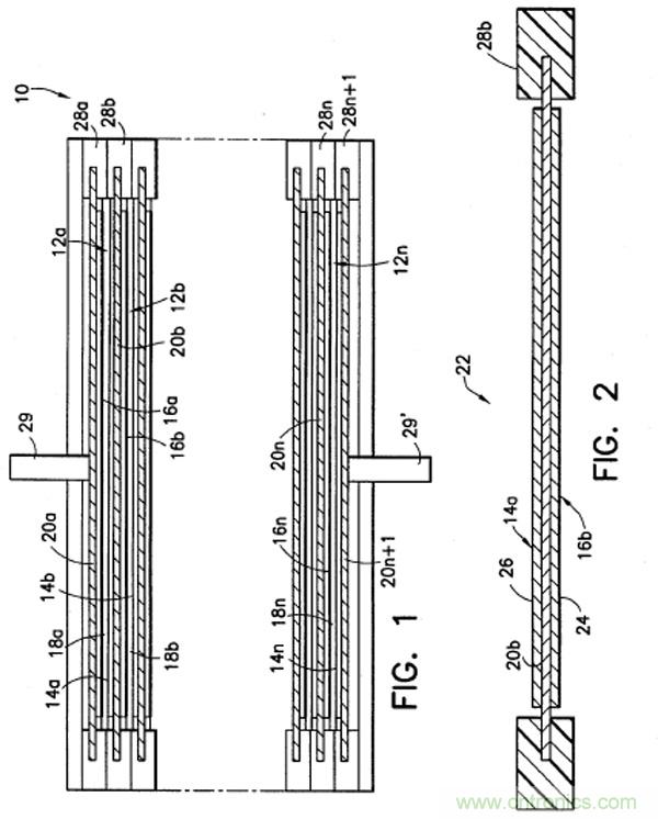 涂層表面上的電流和電勢達(dá)到更加均勻的分布,因此,采用雙極性cell構(gòu)成的電池具有更高的功率特性。下圖Fig1是一個(gè)典型的由多個(gè)雙極性電池單元構(gòu)成的雙極性鋰離子電池截面圖,F(xiàn)ig2是提取出來的其中一個(gè)雙極性電池單元。其中,12a、12b,…,12n是電池單元;14a、14b,…,14n是電池單元的正極側(cè);16a、16b,…,16n是電池單元的負(fù)極側(cè);18a、18b,…,18n隔膜;20b、20c,…,20n是集流體(例如,F(xiàn)ig2中的14a和16b共用一個(gè)集流體),集流體可采用雙金屬基材,例如,Cu-Al雙金屬,負(fù)極活性物質(zhì)涂敷在Cu側(cè),正極活性物質(zhì)涂敷在Al側(cè);24是負(fù)極活性物質(zhì),26是正極活性物質(zhì);28a、28b,…,28n是絕緣性連接固定結(jié)構(gòu),每個(gè)雙極性電極通過該連接結(jié)構(gòu)固定起來。在Fig1和Fig2中,一共有n-1個(gè)雙極性電極(集流體兩側(cè)分別有正極、負(fù)極活性物質(zhì)),最上層20a只有負(fù)極一側(cè),另一側(cè)跟負(fù)極極柱29相連,最下層20n+1只有正極一側(cè),另一側(cè)跟正極極柱29相連。