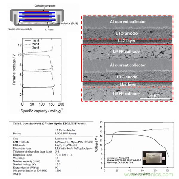 下圖是含有三個(gè)雙極性電極的CR2032鈕扣電池。正極是LFP,負(fù)極是金屬鋰,采用準(zhǔn)固態(tài)聚合物電解質(zhì)和不銹鋼集流體。從電壓曲線可以看到,只要改變雙極性電極的unit數(shù)量,就能改變電池的電壓,這里給的分別是1unit、2units、3units的電壓曲線。例如,很容易通過5個(gè)雙極性的unit實(shí)現(xiàn)一個(gè)12V的鋰離子電池,下圖右側(cè)是日本東芝公司的一個(gè)12V雙極性電池的部分截面圖,從表1的參數(shù)中可以看到,這里正極材料是LiMn0.85Fe0.1Mg0.05PO4,負(fù)極材料是LTO,集流體是Al,固態(tài)電解質(zhì)電解質(zhì)是Li7La3Zr2O12(LLZ)和PAN。從封裝方式來看,疊片式軟包裝是比較適合雙極性電池的一種方式。