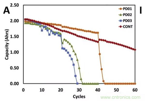 針對(duì)三個(gè)階段電池的衰降機(jī)理的研究認(rèn)為,階段1可能是因?yàn)殡姵豐EI膜生長需要消耗一部分Li+,因此衰降速度較快。在階段2隨著SEI膜結(jié)構(gòu)的穩(wěn)定,內(nèi)部較為穩(wěn)定,因此衰降速度較慢,在階段3隨著電池老化,開始發(fā)生活性物質(zhì)損失,電極活性界面減少,導(dǎo)致電池對(duì)于電流十分敏感。圖C是針對(duì)不同的截止電壓對(duì)電池衰降速度影響的實(shí)驗(yàn),從實(shí)驗(yàn)結(jié)果可以看到,當(dāng)把充電截止電壓提高到4.3V時(shí)會(huì)導(dǎo)致電池的循環(huán)性能急劇惡化,降低充電截止電壓可以有效的改善電池的循環(huán)性能。