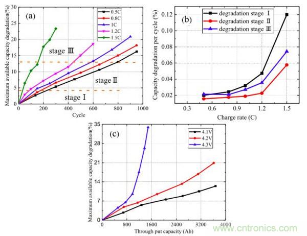 鋰離子電池的放電制度很大程度上依賴于使用者,好的放電制度對(duì)于有的使用者而言并不一定適用。但是充電制度則主要是設(shè)計(jì)者進(jìn)行控制,因此對(duì)于充電制度對(duì)電池壽命衰降的影響的研究,能夠更好的指導(dǎo)我們對(duì)鋰離子電池的設(shè)計(jì)。北京交通大學(xué)的YangGao等針對(duì)不同的充電制度對(duì)鋰離子電池壽命衰降的影響,并研究了其作用機(jī)理,提出了鋰離子電池的壽命衰降模型。YangGao的研究顯示,當(dāng)充電電流和截止電壓超過一定的數(shù)值時(shí),鋰離子電池的衰降將被極大的加速,為了降低鋰離子電池的衰降速率,需要針對(duì)不同的體系,選擇合適的充放電電流和截止電壓。