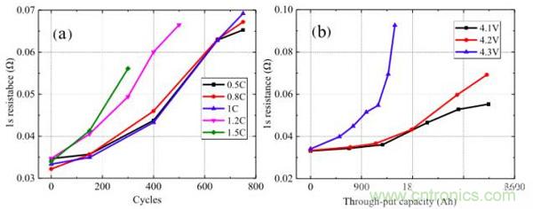 對(duì)電池的動(dòng)態(tài)內(nèi)阻分析如下圖所示,從圖a測(cè)試結(jié)果來看,當(dāng)充電電流小于1C時(shí),電池動(dòng)態(tài)內(nèi)阻隨著電池循環(huán)的變化趨勢(shì)幾乎時(shí)一樣的,但是當(dāng)充電電流超過1C時(shí),電池動(dòng)態(tài)內(nèi)阻增加速度會(huì)隨著充電速率的增加而快速增加。從圖b的測(cè)試結(jié)果來看,當(dāng)充電截止電壓為4.3V時(shí),電池動(dòng)態(tài)內(nèi)阻增加非常迅速表明高截止電壓會(huì)惡化電池的動(dòng)力學(xué)條件,截止電壓為4.1V和4.2V時(shí)電池動(dòng)態(tài)內(nèi)阻增加較為緩慢。