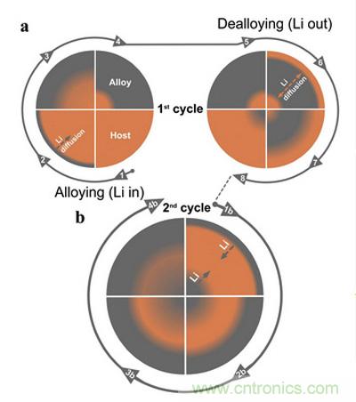 在第1次合金化過程中,Li+首先進入從活性物質顆粒表面,產(chǎn)生濃度差。然后以進一步向顆粒內部擴散,形成Li+濃度梯度分布。但是,顆粒內部仍有Li+難以到達的區(qū)域;
