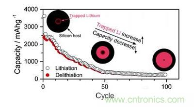 如此往復,惡性循環(huán),導致每次的嵌鋰量逐漸降低。導致顆粒從核心向表層逐漸被鋰化,形成了“死鋰”(如圖2所示)。