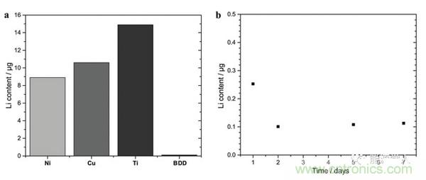 不僅活性物質本身存在俘獲鋰的能力,集流體也存在同樣的情況。為了研究這一情況,作者將鎳、銅、鈦、硼摻雜金剛石四種物質分別與金屬鋰直接接觸,在50℃條件下密封保存1周后發(fā)現(xiàn),鎳、銅和鈦重量變化都非常大(通過實驗前后,樣品的質量變化進行判斷),說明金屬鋰可以直接向這三種物質中進行擴散。只有硼摻雜金剛石的重量未發(fā)生變化,通過HAXPES和TOF-SIMS檢測也未發(fā)現(xiàn)Li的信號,因此硼摻雜金剛石最為適合作為負極集流體。