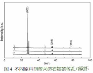 圖4是不同原料、相同制備工藝制成的三種人造石墨A、B、C的XRD圖譜,由圖4可知:A、B、C三種材料的主峰位置基本相同,均位于26°2θ角附近,說明經(jīng)過高溫石墨化處理后的A、B、C三種材料形成了石墨晶體的六方晶型結構。