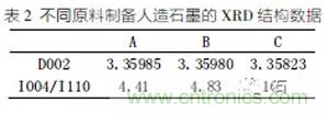 表2是不同原料制備人造石墨的XRD結構數(shù)據(jù),由數(shù)據(jù)可知:A、B、C三種材料的D002值依次減少,說明三種材料的石墨化程度依次升高;I004/I110值依次升高,說明三種材料的取向性依次變差。這與原料的偏光測試結果是一致的。取向性好的材料嵌鋰的速度更快。