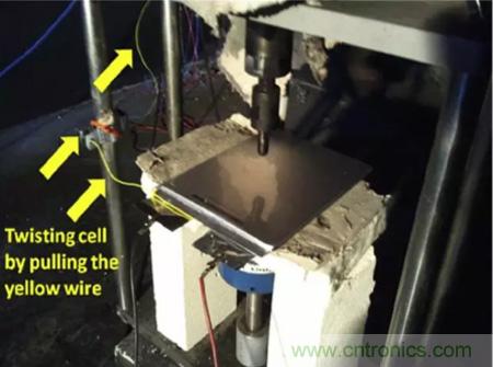 目前能夠模擬鋰離子電池內(nèi)短路的方式有多種,例如針刺測試,小壓痕測試,BAJ測試和機械擠壓測試等,通過對大尺寸方形電池特點的分析,Hsin Wang認為機械擠壓測試最適合應(yīng)用方形鋰離子電池的測試上。但是在傳統(tǒng)的擠壓的測試中由于電池受到的破壞太大,幾乎所有的電池都會發(fā)生熱失控,因此傳統(tǒng)的擠壓測試對不同種類電池安全性的“分辨率”就很低,只有通過和不通過兩種結(jié)果,只能對鋰離子電池的安全性進行定性分析??赡軆蓚€電池都沒有通過安全性測試,但是A電池的安全性卻要好于B電池,為了能夠準確的評估不同體系電池的安全性能,Hsin Wang對傳統(tǒng)的擠壓實驗進行了改進,通過在電池負極極耳上施加一個拉力,讓電池產(chǎn)生大約5°的扭曲,從而減少在擠壓過程中電池受到的破壞,因此該實驗?zāi)軌驕蚀_的評估不同種類電池的的安全性高低。