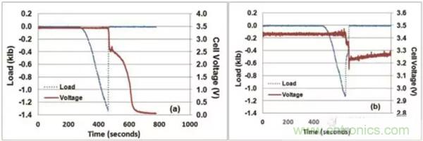 為了方便讀者理解本文,下圖是給出了LFP電池一個非常典型的成功通過機械擠壓測試(正反饋)的判據(jù),電池擠壓變形達到一定的程度后,引起了電池內(nèi)短路的發(fā)生,電池電壓迅速下降,檢測到電壓下降后(0.1V),擠壓力隨之被移除,電池的電壓快速回升,電池沒有發(fā)生熱失控,則電池通過擠壓實驗。