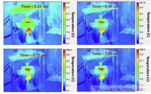 下圖為60%SoC的NMC電池在擠壓-扭轉(zhuǎn)實驗中的熱成像圖,從圖中可以看到在短路發(fā)生后,短路點的溫度在0.5S內(nèi)迅速升高到了147.5 ℃,隨后高溫區(qū)域迅速向周圍擴展,說明周圍區(qū)域溫度升高并不是由熱傳導(dǎo)導(dǎo)致的,而是高溫引發(fā)了其他的化學(xué)反應(yīng)。而在80%SoC下,NMC電池發(fā)生熱失控的溫度更高,引起周圍化學(xué)反應(yīng)的速度也更快。