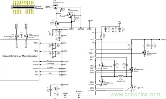 NCP81239支持寬輸入電壓范圍,提供從150 kHz至1.2 MHz動態(tài)可編程的開關(guān)頻率,集成4個MOSFET驅(qū)動,采用雙沿電流模式控制,支持輸出預偏置啟動,自適應死區(qū)時間控制防止直通,具有獨立的輸入和輸出電流檢測,輸出電壓(范圍0至20V)可以通過I2C 編程,集成過壓、欠壓、過流和精確的過載保護等完善的保護功能,同時還提供對5 V Vconn電源的保護。