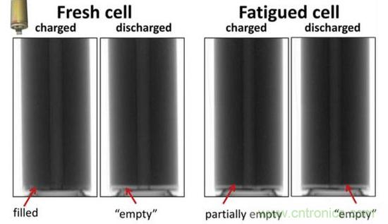 鋰離子電池主要由正極、負(fù)極、隔膜和電解液,以及結(jié)構(gòu)件等部分組成,在鋰離子電池的外部,通過導(dǎo)線和負(fù)載等,將負(fù)極的電子傳導(dǎo)到正極,而在電池內(nèi)部,正負(fù)極之間則通過電解液進(jìn)行連接,在放電的時候,Li+通過電解液從負(fù)極擴散到正極,嵌入到正極的晶體結(jié)構(gòu)之中。所以在鋰離子電池中,電解液是非常重要的一環(huán),對鋰離子電池的性能有著重要的影響。理想的情況下,正負(fù)極之間應(yīng)該有充足的電解液,在充放電的過程中都應(yīng)該具有足夠的Li+濃度,從而減小由于電解液的濃差極化造成的性能衰降。但是在實際充放電過程中,受制于Li+擴散速度等因素,在正負(fù)極會產(chǎn)生Li+濃度梯度,Li+濃度隨著充放電而波動。由于結(jié)構(gòu)設(shè)計和生產(chǎn)工藝等原因,還會導(dǎo)致電解液在電芯內(nèi)部的分布不均勻,特別是在充電的過程中,隨著電極的膨脹,會在電芯的內(nèi)部形成部分“干區(qū)”,“干區(qū)”的存在導(dǎo)致了能夠參與到充放電反應(yīng)中的活性物質(zhì)減少,引起電池內(nèi)局部SoC不均勻,從而導(dǎo)致電池內(nèi)局部老化速度加快。M.J. Mu hlbauer在研究鋰離子電池老化對Li分布的影響中曾發(fā)現(xiàn),由于在充放電過程中,正負(fù)極極片都存在一定體積膨脹,導(dǎo)致電芯也存在一定程度的體積膨脹和收縮,電芯會如同“呼吸”一般,反復(fù)的“吸入”和“吐出”電解液,所以不同時刻,電解液在電芯內(nèi)的浸潤情況也在實時變化(如下圖所示)。