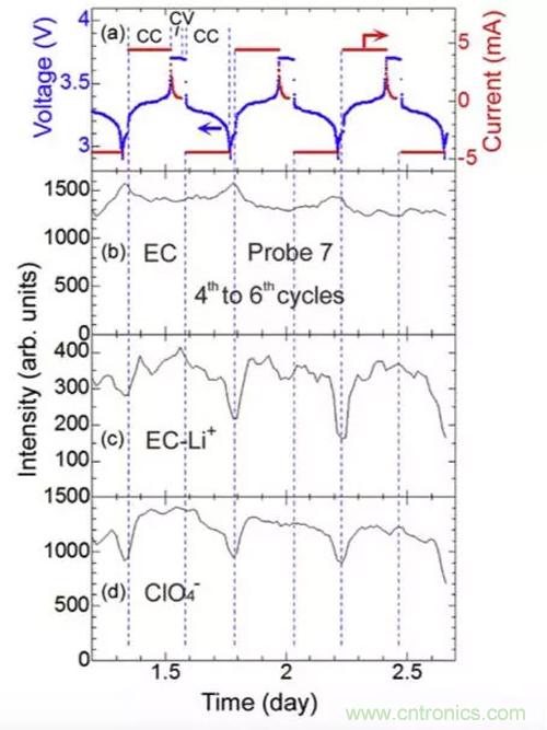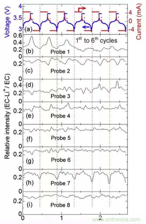 在研究Li+濃度的變化過程中,Toshiro Yamanaka還發(fā)現(xiàn)電解液的分布也隨著充放電而發(fā)生變化。下圖是在充放電過程中不同位置溶劑EC的強度的變化趨勢,EC的強度變化主要反映該處電解液的數(shù)量多少,隨著電芯的體積變化,電芯內(nèi)的電解液分布也在不斷的發(fā)生著變化。例如在1號和2號位置,EC的濃度發(fā)生了兩次快速下降和緩慢恢復(fù),6號探測器的位置,則出現(xiàn)了EC濃度的快速下降和快速上升,這些變化都反映了鋰離子電池內(nèi)部在充放電過程中,由于電極的體積膨脹,導(dǎo)致電解液在電芯的局部發(fā)生變干、再浸潤的過程。