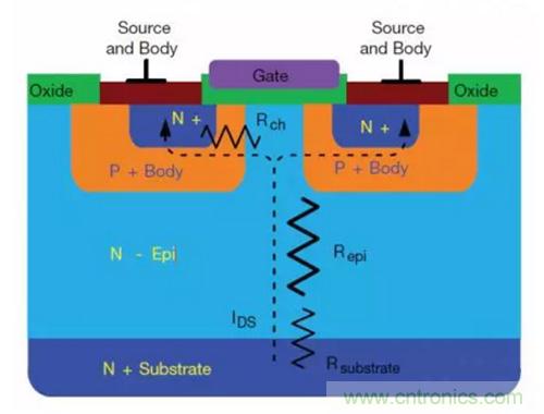 圖1顯示了一種傳統(tǒng)平面式高壓MOSFET的簡單結構。平面式MOSFET通常具有高單位芯片面積漏源導通電阻,并伴隨相對更高的漏源電阻。使用高單元密度和大管芯尺寸可實現(xiàn)較低的RDS(on)值。但大單元密度和管芯尺寸還伴隨高柵極和輸出電荷,這會增加開關損耗和成本。另外還存在對于總硅片電阻能夠達到多低的限制。器件的總RDS(on)可表示為通道、epi和襯底三個分量之和: