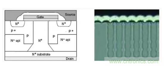通常,高壓的功率MOSFET采用平面型結構,其中,厚的低摻雜的N-的外延層,即epi層,用來保證具有足夠的擊穿電壓,低摻雜的N-的epi層的尺寸越厚,耐壓的額定值越大,但是其導通電阻也急劇的增大。導通電阻隨電壓以2.4-2.6次方增長,這樣,就降低的電流的額定值。為了得到一定的導通電阻值,就必須增大硅片的面積,成本隨之增加。如果類似于IGBT引入少數(shù)載流子導電,可以降低導通壓降,但是少數(shù)載流子的引入會降低工作的開關頻率,并產生關斷的電流拖尾,從而增加開關損耗。