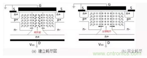 垂直導電N+區(qū)夾在兩邊的P區(qū)中間,當MOS關斷時,形成兩個反向偏置的PN結:P和垂直導電N+、P+和外延epi層N-。柵極下面的的P區(qū)不能形成反型層產生導電溝道,P和垂直導電N+形成PN結反向偏置,PN結耗盡層增大,并建立橫向水平電場;同時,P+和外延層N-形成PN結也是反向偏置形,產生寬的耗盡層,并建立垂直電場。由于垂直導電N+區(qū)摻雜濃度高于外延區(qū)N-的摻雜濃度,而且垂直導電N+區(qū)兩邊都產生橫向水平電場,這樣垂直導電的N+區(qū)整個區(qū)域基本上全部都變成耗盡層,即由N+變?yōu)镹-,這樣的耗盡層具有非常高的縱向的阻斷電壓,因此,器件的耐壓就取決于高摻雜P+區(qū)與低摻雜外延層N-區(qū)的耐壓。