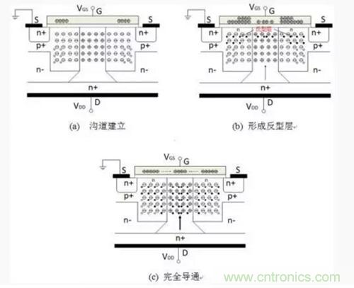 當MOS導通時,柵極和源極的電場將柵極下的P區(qū)反型,在柵極下面的P區(qū)產生N型導電溝道,同時,源極區(qū)的電子通過導電溝道進入垂直的N+區(qū),中和N+區(qū)的正電荷空穴,從而恢復被耗盡的N+型特性,因此導電溝道形成,垂直N+區(qū)摻雜濃度高,具有較低的電阻率,因此導通電阻低。