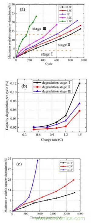 從上述分析我們可以注意到,無論是充電電流還是充電截止電壓都存在一個(gè)值,當(dāng)充電電流或者電壓超過這個(gè)值時(shí)就會(huì)導(dǎo)致電池衰降加速,對(duì)于上述電池這個(gè)值是1C和4.2V,當(dāng)充電電流和截止電壓超過這個(gè)值后就會(huì)加速電池的衰降,當(dāng)小于這個(gè)值時(shí),提高充電電流和截止電壓并不會(huì)顯著的增加電池的衰降速度。對(duì)于充電電流和截止電壓對(duì)電池衰降速度影響的機(jī)理研究顯示,當(dāng)充電電流低于1C時(shí)主要影響的是正負(fù)極活性物質(zhì)損失,而截止電壓低于4.2V時(shí)影響的主要是Li損失,當(dāng)充電電流和截止電壓高于這個(gè)值時(shí),則會(huì)顯著的加速正負(fù)極活性物質(zhì)損失和Li損失。