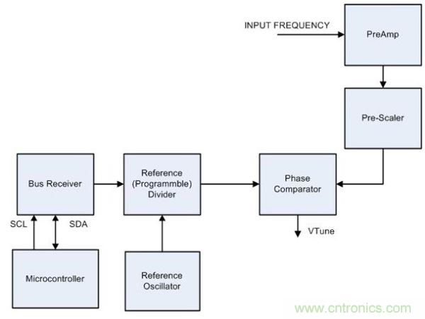 微控制器通過 I2C 發(fā)送數(shù)據(jù)到可編程分頻器。該分頻器也接收來自參考振蕩器(例如 4 MHz 晶體振蕩器)的輸入。相位比較器(即相位檢測器)通過預(yù)分頻器接收本地振蕩器頻率(例如 87.15 MHz),還通過參考分頻器和參考振蕩器接收微控制器的輸入(例如,87.15 MHz)。如果兩個(gè)輸入都匹配,相位比較器將提供 Vtune 調(diào)諧電壓。一旦本地振蕩器頻率與微控制器頻率數(shù)據(jù)之間稍有不匹配,都將無法提供調(diào)諧電壓 (Vtune) 和輸出。圖 3 所示為完整的框圖。