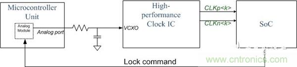 對某些應(yīng)用而言,輸出時(shí)鐘頻率應(yīng)通過使用模擬反饋跟蹤輸入數(shù)據(jù)流。如圖 5 所示,時(shí)鐘 IC 作為大鎖相環(huán)的一部分。ASIC 或 SoC 負(fù)責(zé)跟蹤輸入流、計(jì)算誤差并產(chǎn)生 PWM 信號(hào)(通常來說),隨后將誤差信息反饋至本地時(shí)鐘發(fā)生器以進(jìn)行頻率調(diào)諧。