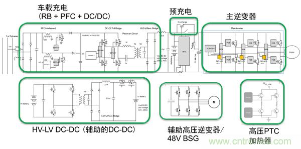 HEV/EV的重點(diǎn)應(yīng)用有:車載充電器、電池管理、牽引逆變器、輔助逆變器、48 V皮帶啟動(dòng)發(fā)電機(jī)(BSG)和DC-DC轉(zhuǎn)換器。