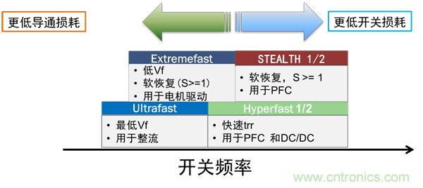 根據(jù)不同的應(yīng)用,整流器可選擇更低導(dǎo)通損耗或更低開關(guān)損耗的產(chǎn)品,各類產(chǎn)品的主要特點(diǎn)及應(yīng)用如圖2所示。