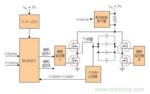 Qi發(fā)射器控制器擁有輸入功率限制選項(xiàng),至發(fā)射器的輸入電流可被限制在500mA,從而允許通過(guò)USB端口或小型電源適配器供電運(yùn)行。bq500211發(fā)射器的穩(wěn)壓電路有3.3V的LDO穩(wěn)壓器構(gòu)成輸出芯片供電,LDO的最大優(yōu)勢(shì)就是PNP管只會(huì)帶來(lái)很小的導(dǎo)通壓降,滿載的跌落電壓的典型值小于500mV,輕載時(shí)的壓降僅有10~20mV。LDO的壓差為:Vdrop = Vsat (LDO 穩(wěn)壓器)。
